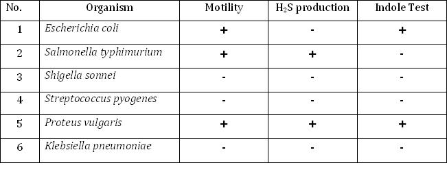 In agar stab method Proteus vulgaris showed a well dispersed growth from the line of inoculation which is evident of motility, presence of black precipitate indicates that H2S is produced and presence of red colouration in the medium after the addition of Kovac’s reagent indicates positive indole test while Klebsiella pneumoniae is non motile and negative for H2S production and indole test .